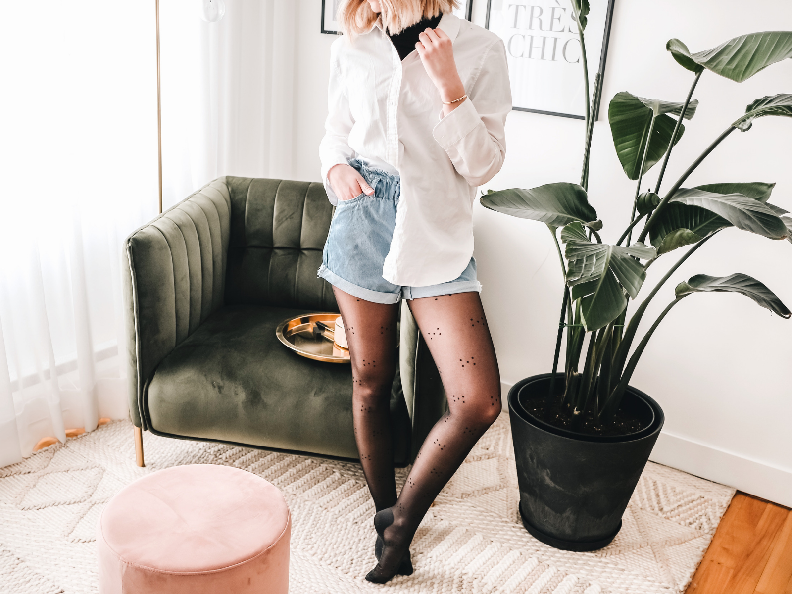 We often think that denim shorts are just made for summer, but they also make a great spring look when combined with tights. Shorts are way more practical than you may think and are a great item (that you probably already own) to create different looks with. To give this style a try, start by grabbing your favourite pair of tights and I’m convinced you’ll become obsessed with this outfit combo. Here are 3 outfit ideas to rock tights and jean shorts this spring! The casual look For a weekend outfit, this look is the perfect option. It’s comfortable and original thanks to the ultimate casual piece and closet must-have: The logo shirt. Add it to your wardrobe to create casual and stylish looks and don’t doubt wearing it with shorts and tights. I opted for Rachel’s Grey Pink Polka Dot Tights to finish my outfit. The chic look Denim shorts are ideal for a casual look, but they can also be styled for dressier occasions. For this outfit, I opted for a tweed jacket to add a touch of chic to my look (the Chanel way). A fitted jacket or blazer is just what you need to dress up your denim jeans, while Grey Pink Polka Dot Tights will add a feminine finish. The smart look A crisp white shirt combined with your shorts and tights will give you a smart look that’s perfect for a family activity or for brunch with the girls. I added a turtleneck under my shirt to give it a totally different look and finished my outfit with Rachel’s 5-Dot Tights. After all, polka dots are always in style! What look will you recreate with your denim shorts this season? Xo, Justine